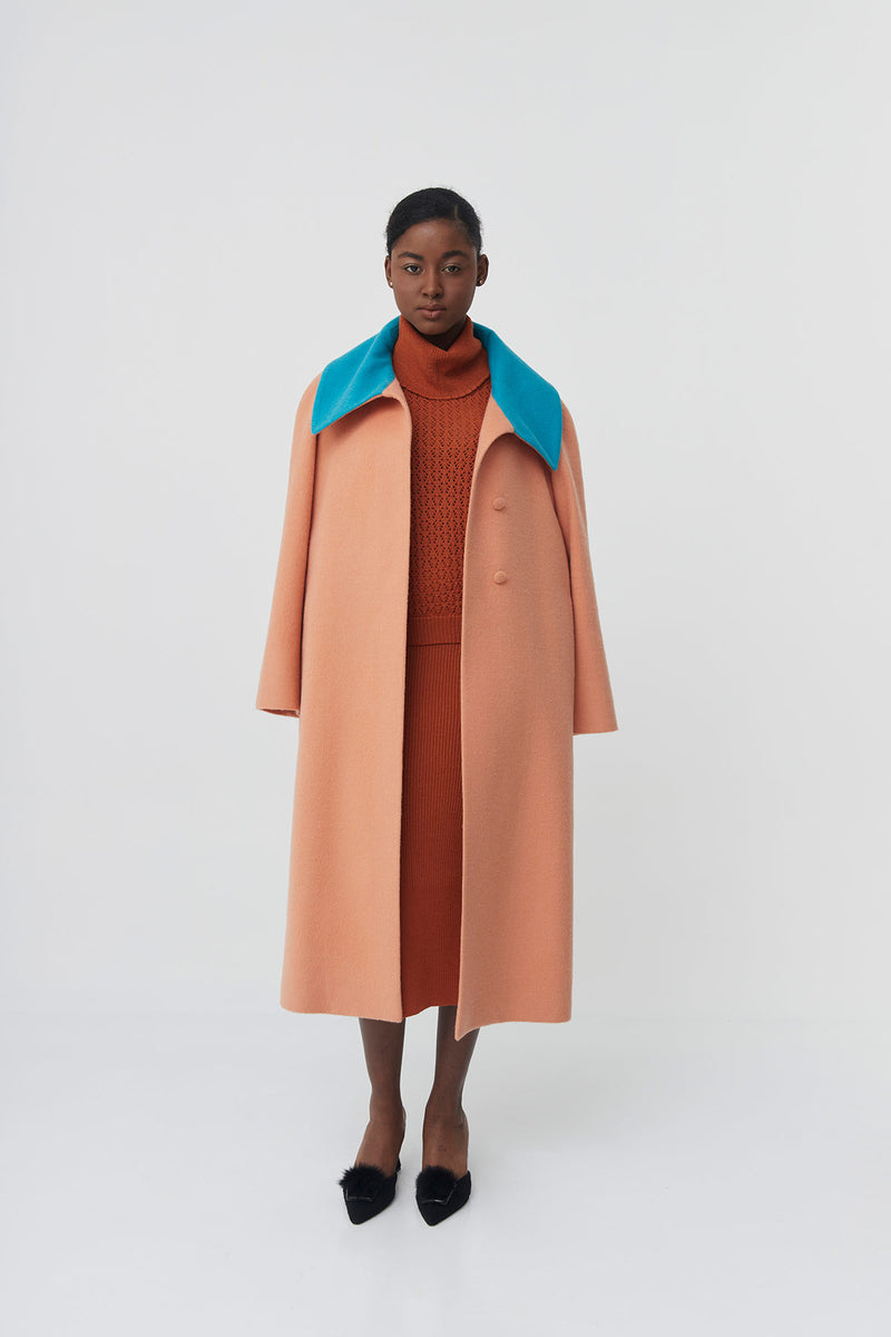 Un abrigo de declaración con una silueta amplia que proyecta una presencia escultórica y a la vez natural. Concebido con dos botones ocultos que aportan un frente limpio y minimalista, incorpora un distintivo botón en el cuello que permite llevar la solapa semi-cerrada o completamente cerrada como un cuello alto, ofreciendo múltiples posibilidades de estilo según el ánimo y el clima.