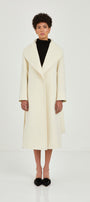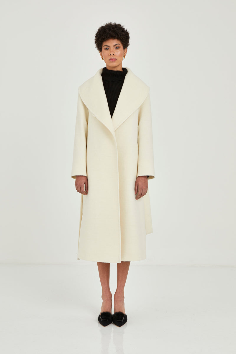 Pieza de la línea Classic Drape, confeccionada en Baby Suri Alpaca. Su cuello está formado por una solapa ancha con un acabado impecable. Cuenta con un botón para cerrarla y un cinturón para ajustar la cintura.