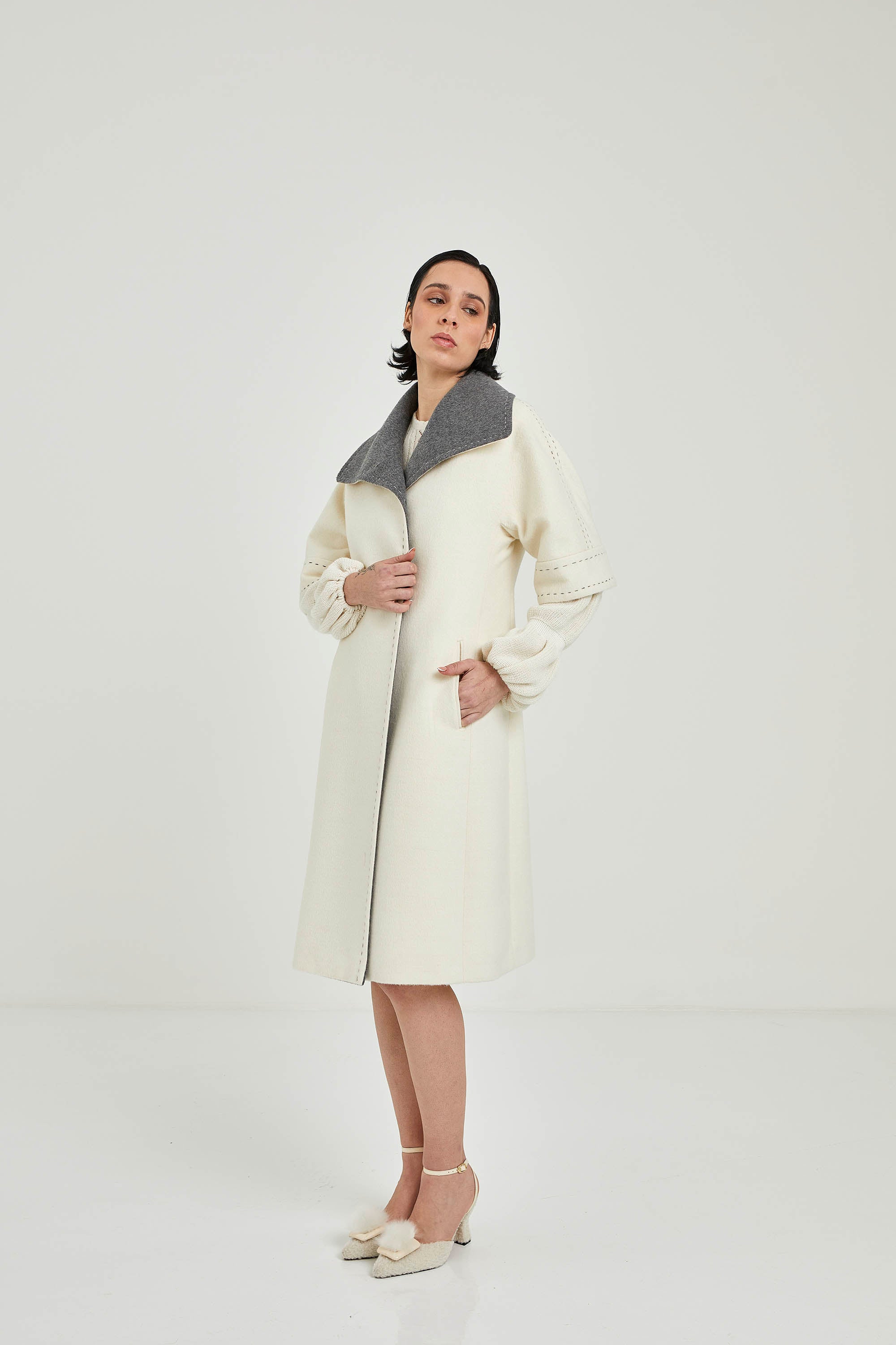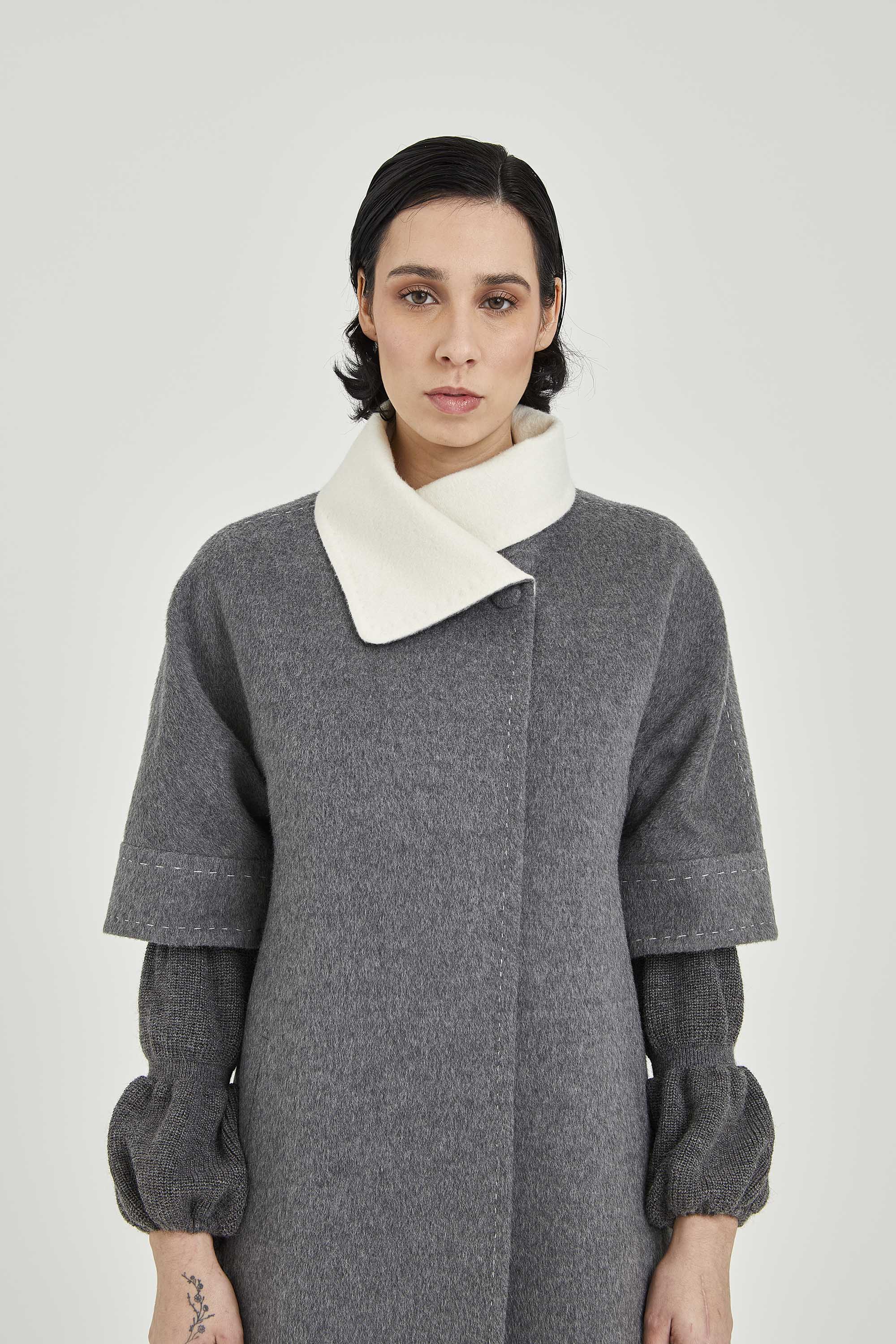 Short sleeve coat made in baby alpaca. The model has two hidden buttons and a button on the collar to show off a closed collar with contrasting color. The cuffs and collar have hand-stitched details.
